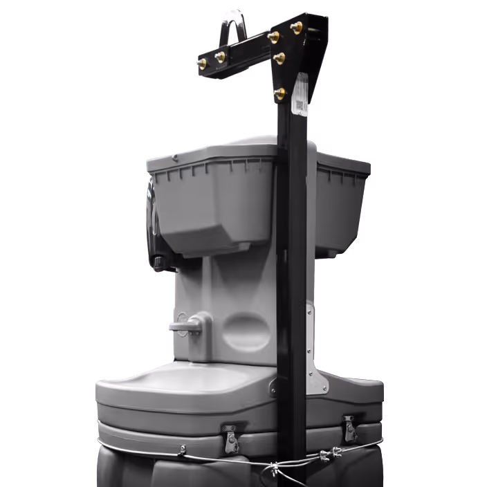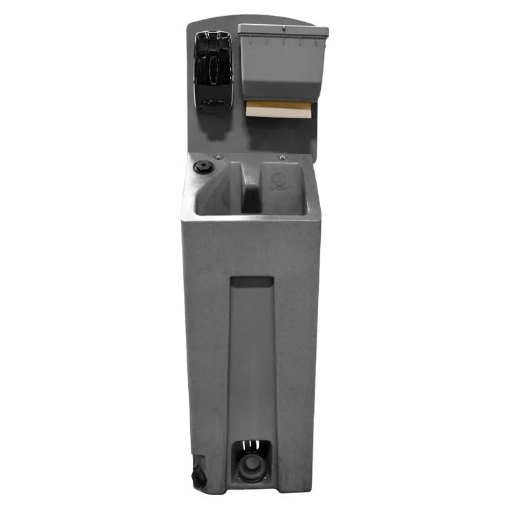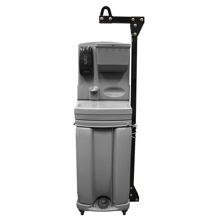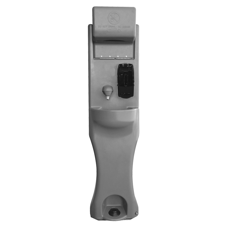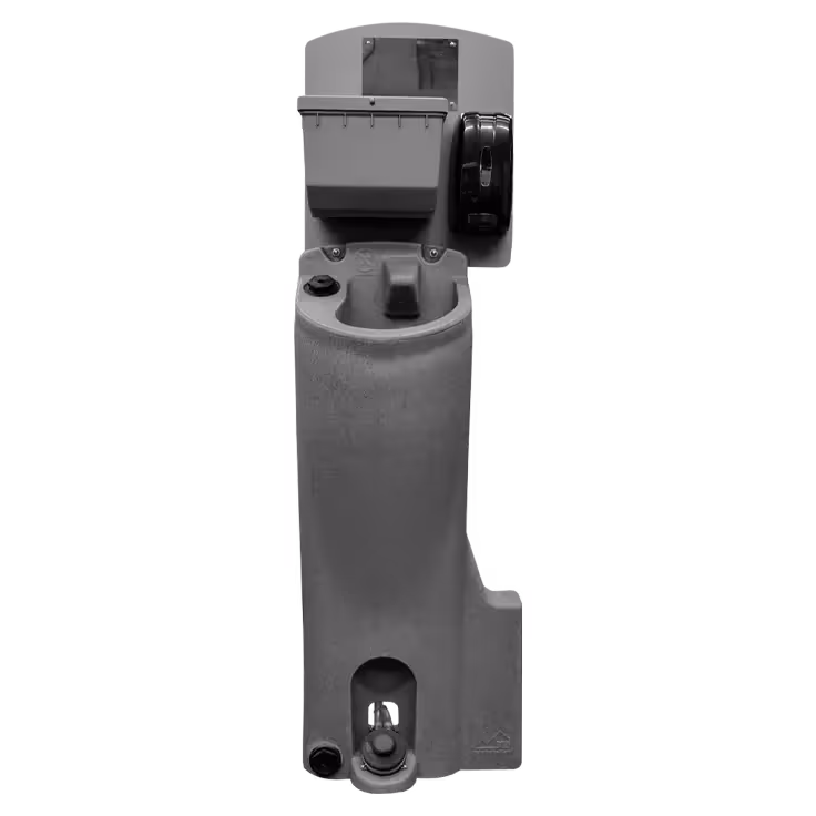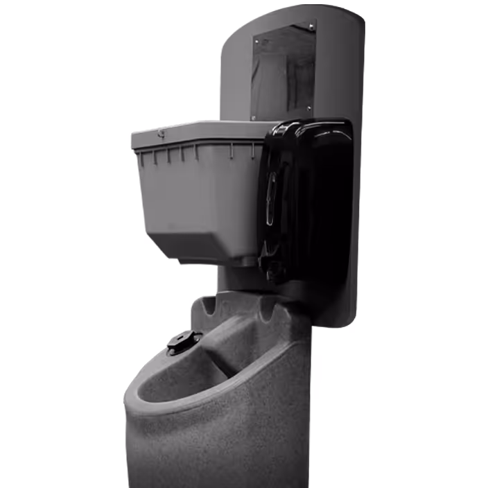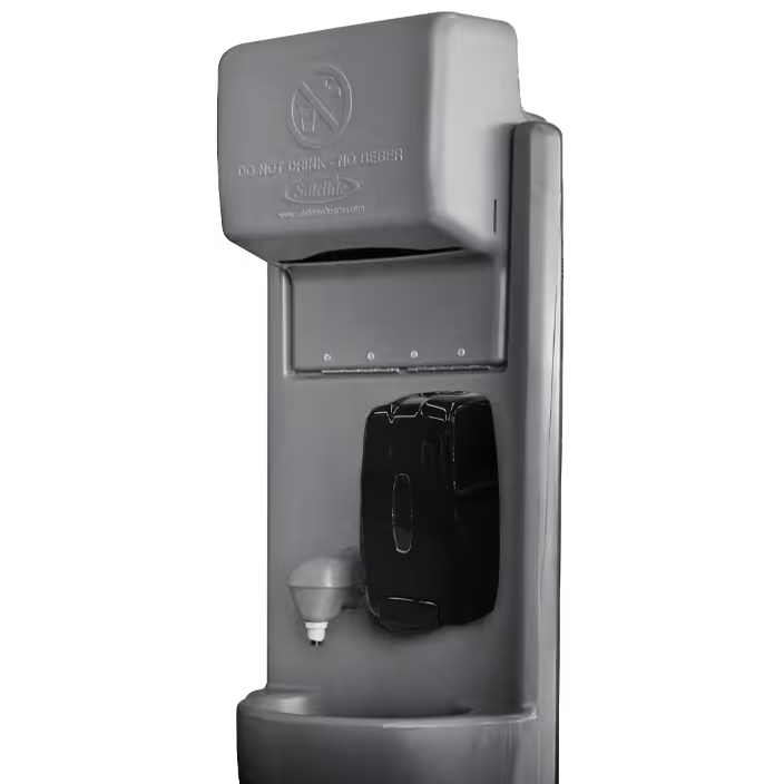 Ideal for use inside portable restrooms, these in-unit portable handwashing stations can be installed for convenience, ease of use, and elimination of cross-contamination between the restroom and a centralized outdoor sink. These units drain into the portable restroom waste tank, making for easier service and maintenance.