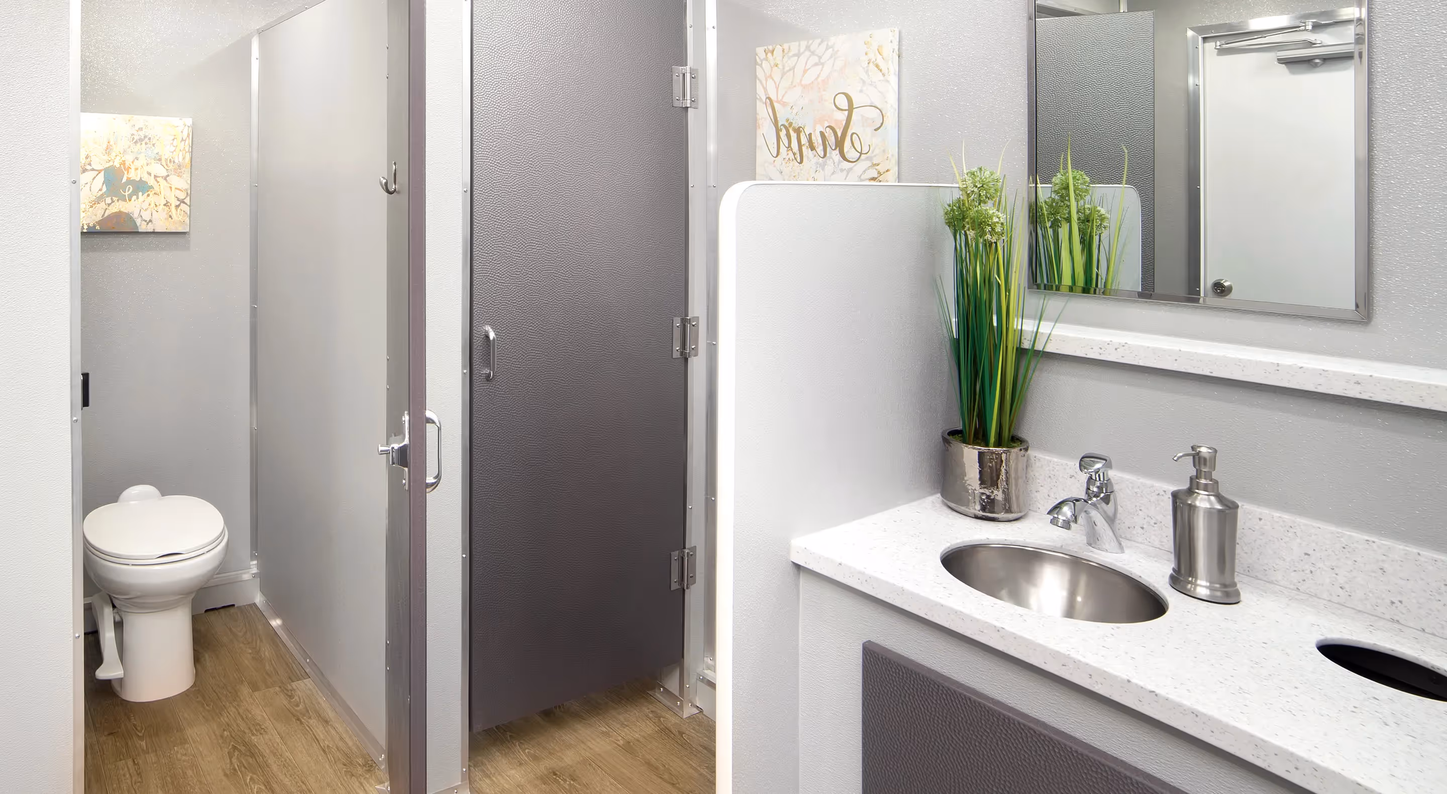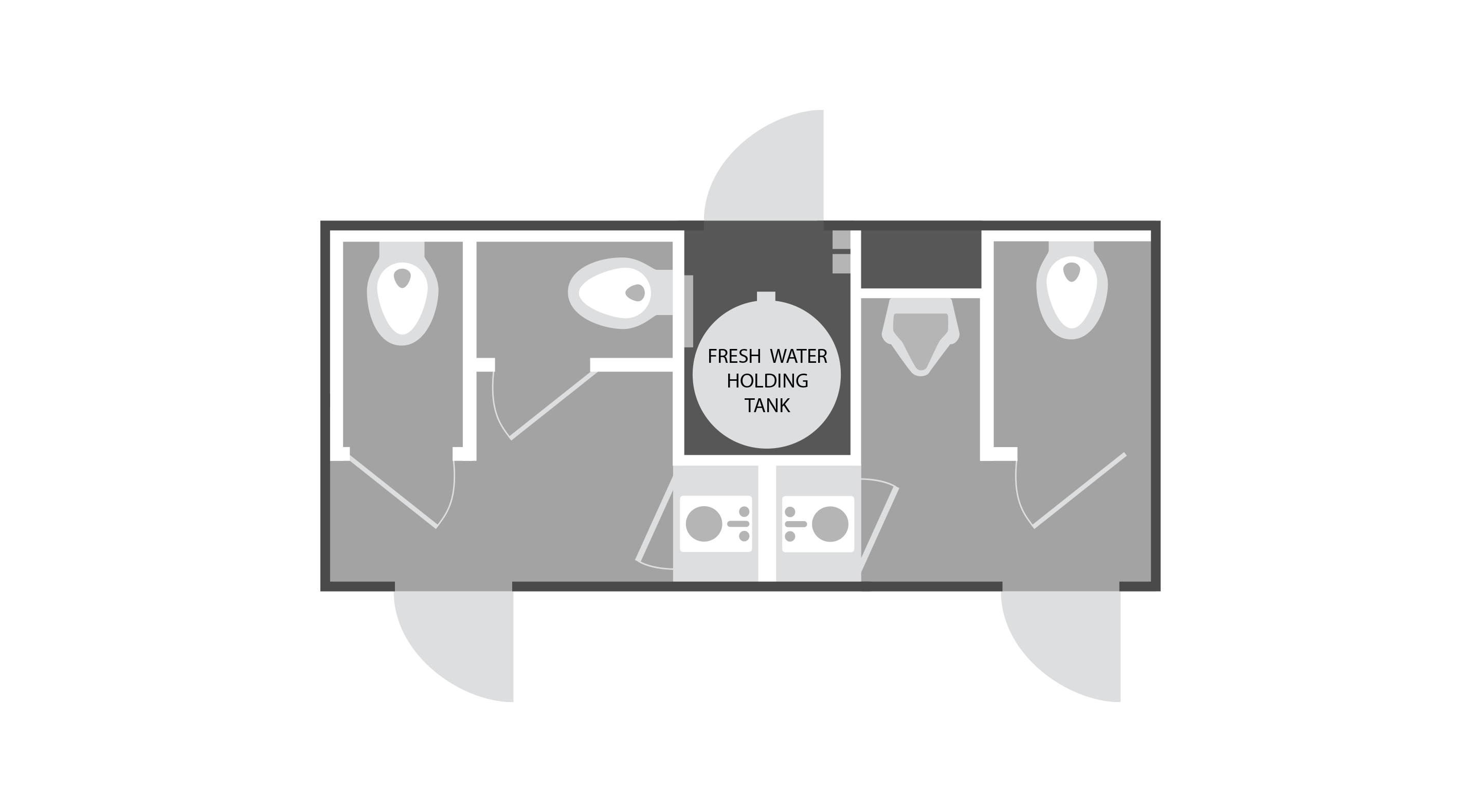 This spacious 4-Station restroom trailer has a delightful interior and enough capacity to provide up to 350 guests a true first-class experience.
