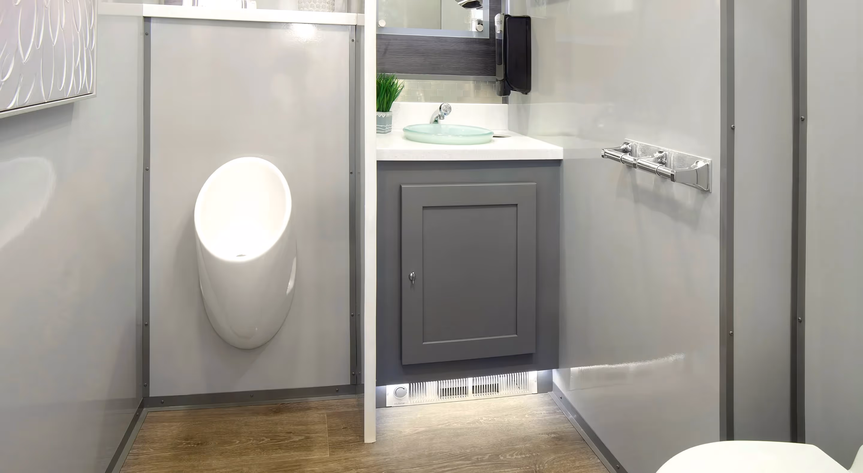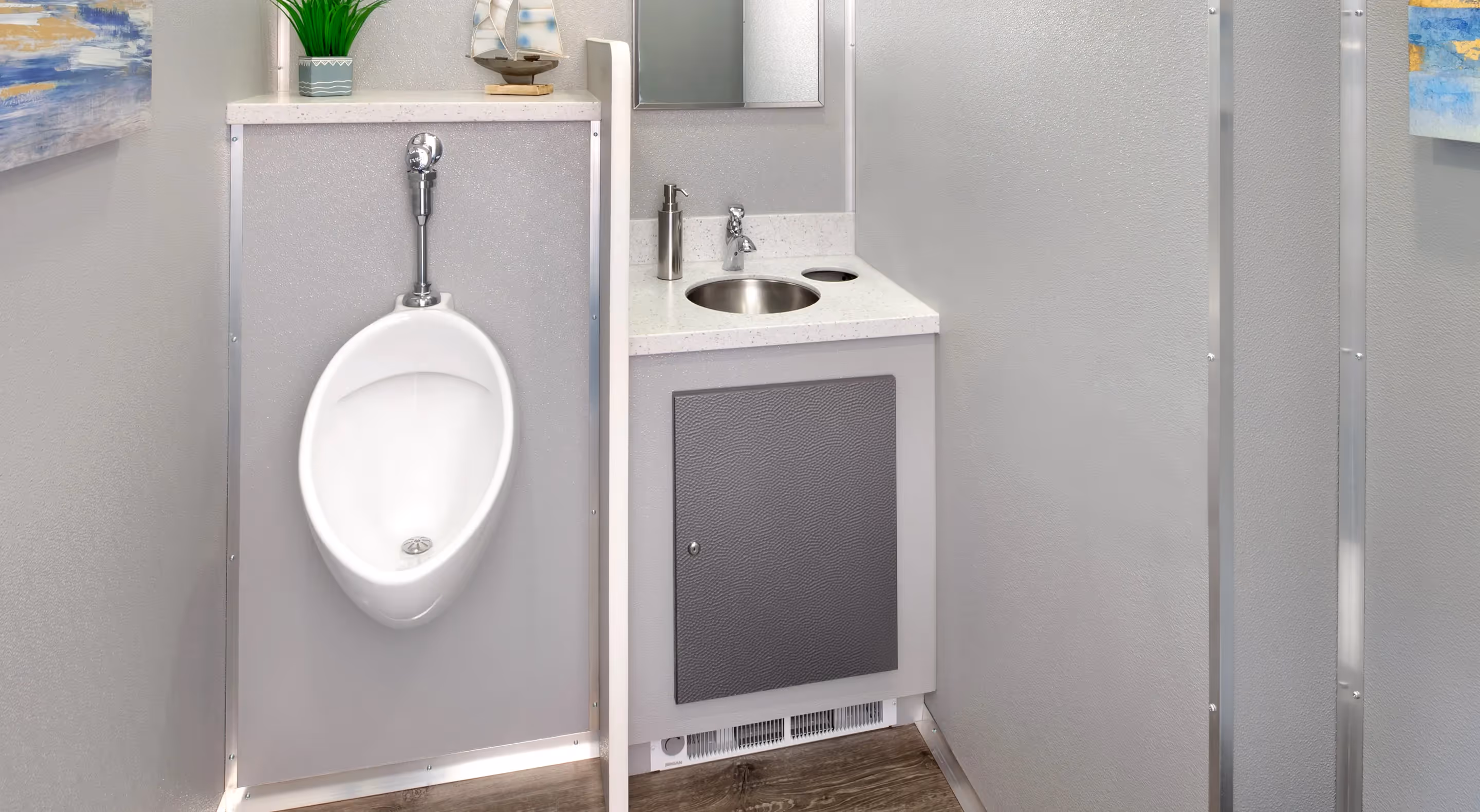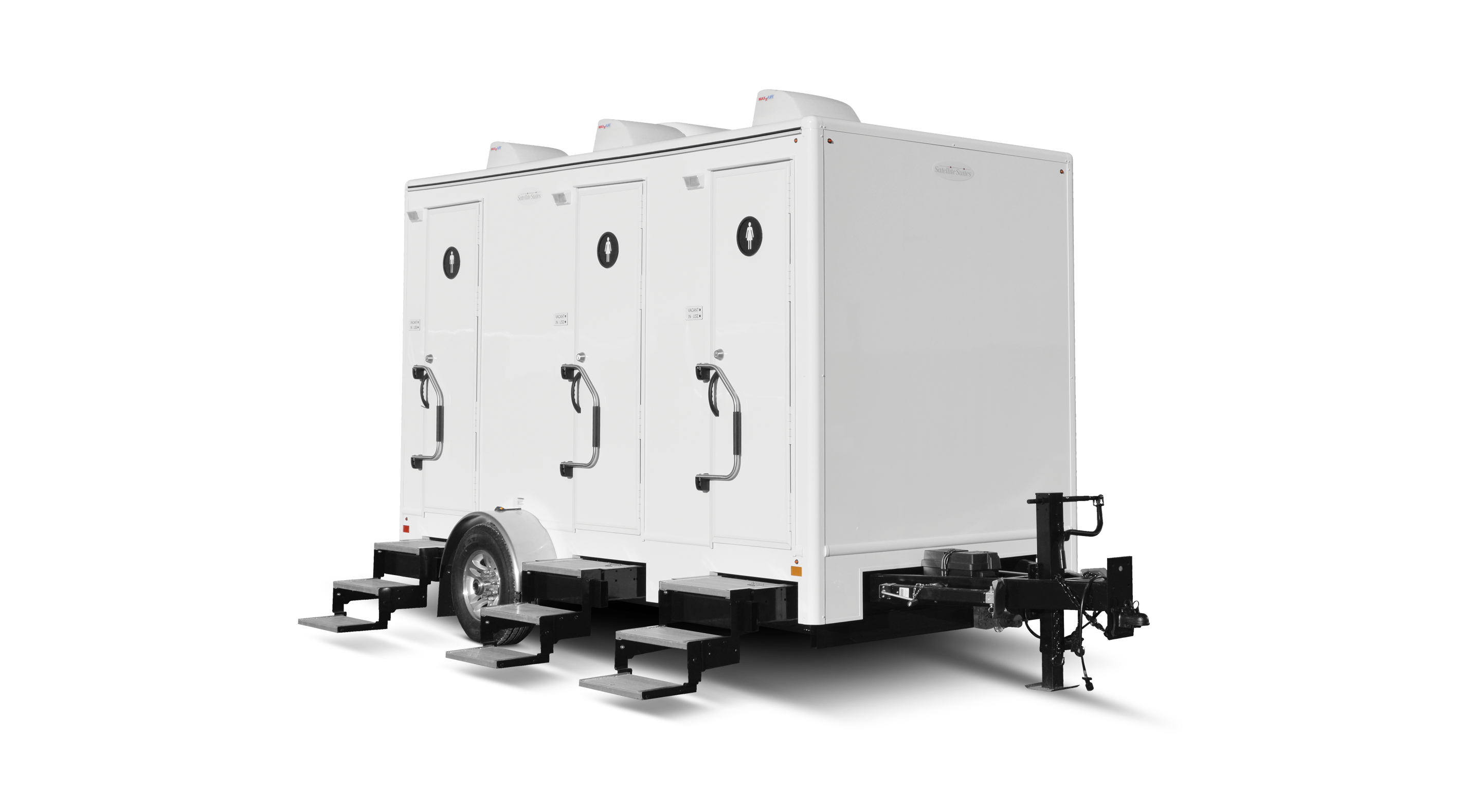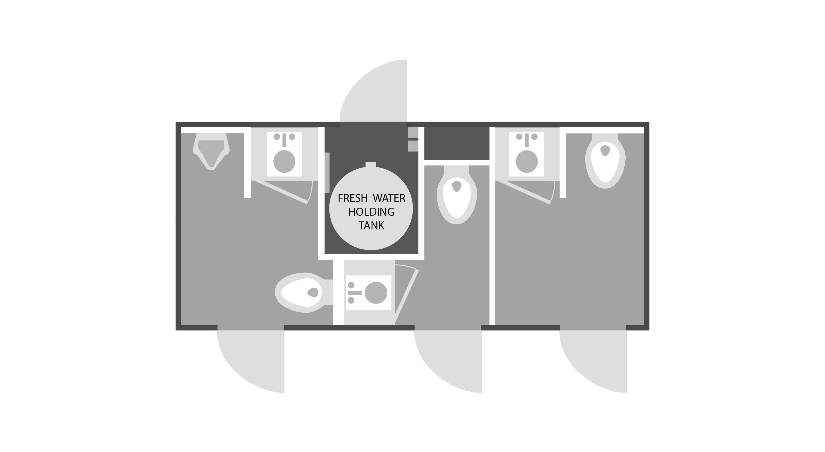 Most three-station trailers are 12’, but this trailer is two feet longer and the benefit is clearly felt and seen when using the separate stations. The other benefit, which is also true with all other Satellite Suites trailers, is the position of all doorways on the same side of the trailer. This makes positioning the trailer a simple process and insures users will take full advantage of each station. As for durability, Satellite Suites trailers are made of non-wood materials to prevent costly water damage to the interior structure and also prevent the accumulation of mold and mildew, which can occur on wood frame structures. The trailer also utilizes seamless external and interior surfaces to prevent water from finding its way into the structure. Additional features included a patented Over Armor roof™, non-wood trim, a polyethylene waste tank with bottom sump, all designed to prevent moisture and odor problems from developing.
