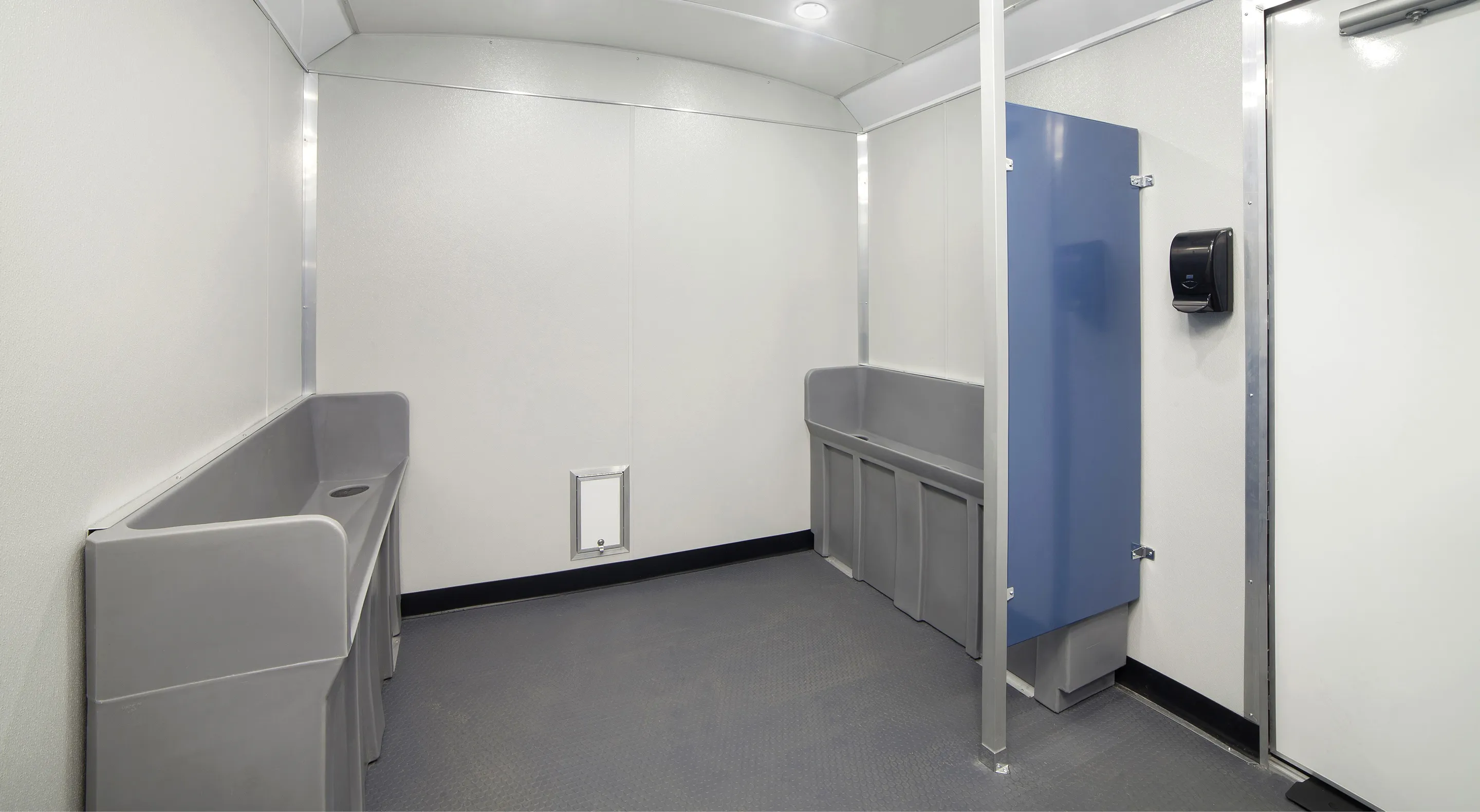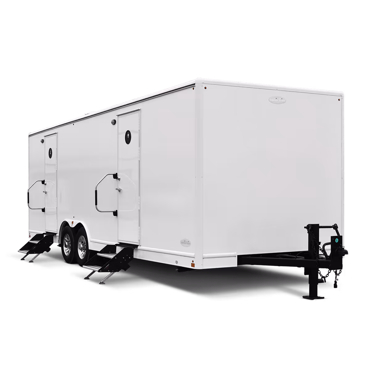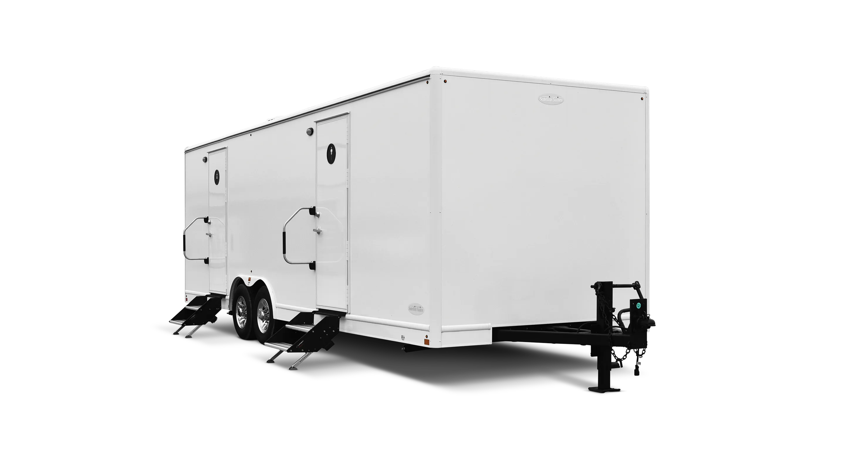 Satellite Suites has created a beautiful 26-foot, two-door, 15-station trailer for high traffic rural events, construction sites, and oil field operations. The RoughneckTM uses our portable restroom urinals and tanks, eliminating the need for running water and cutting down the amount of time between services. The women’s restroom has six private stalls and the men’s has three private stalls and two urinal troughs allowing for easy flow on jobsite or at an event. This restroom trailer has air conditioning, lighting and is equivalent to about 15 portable toilets.