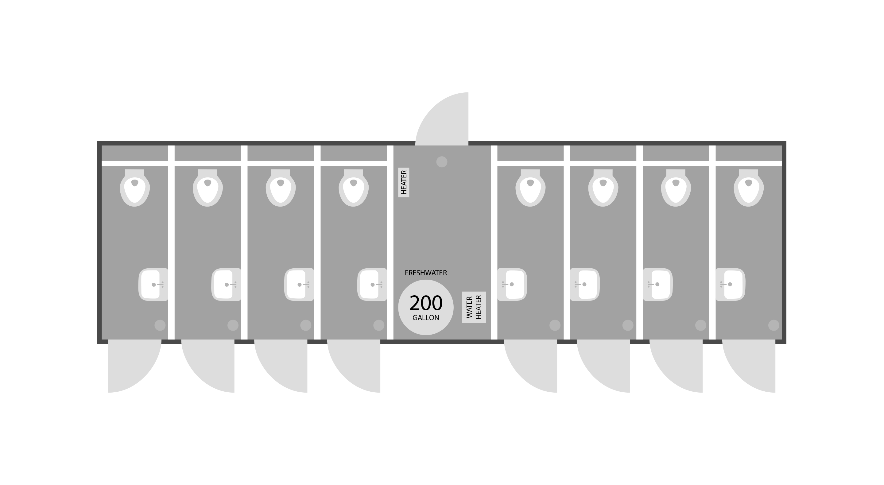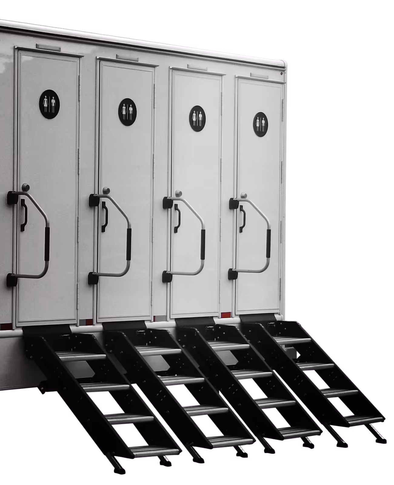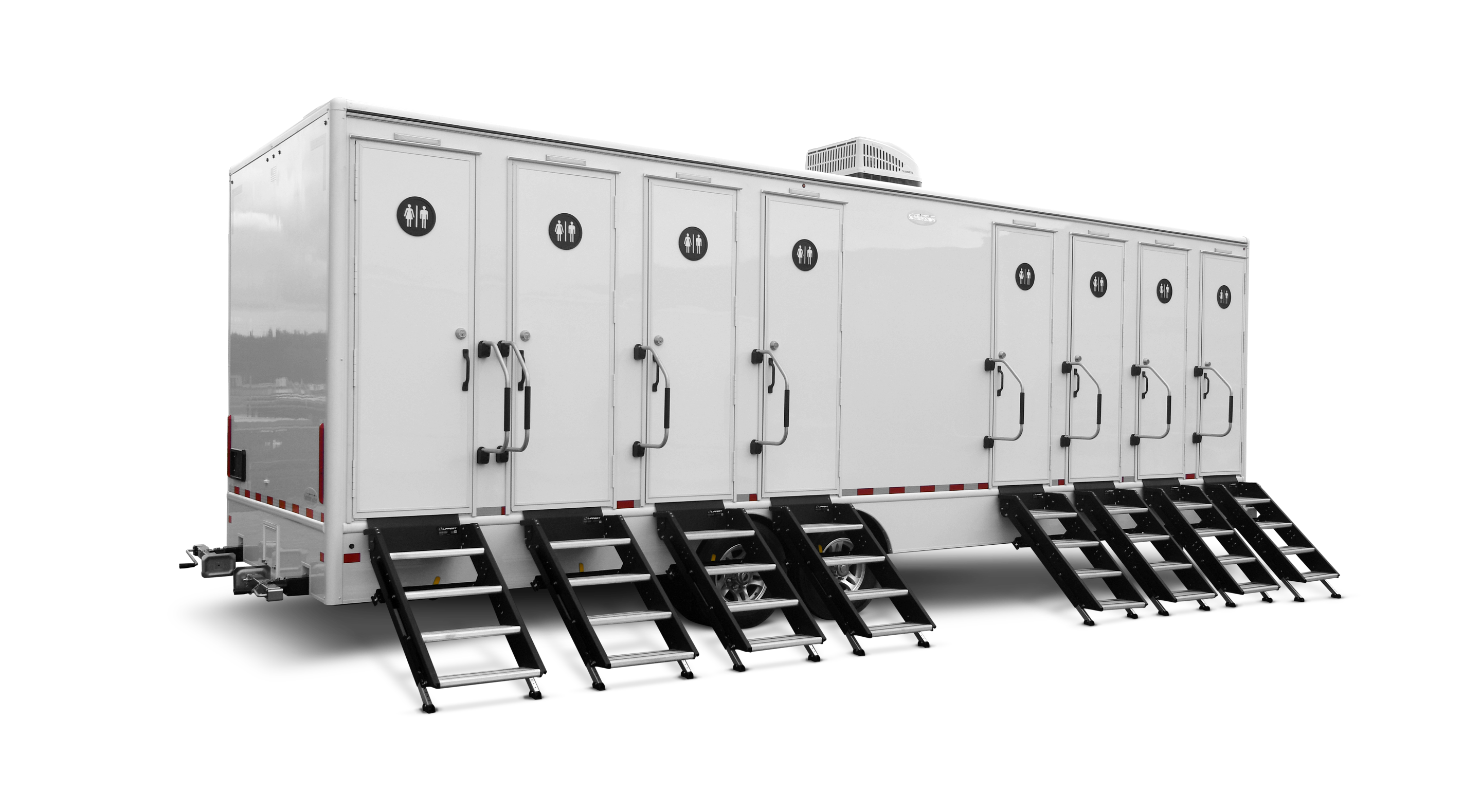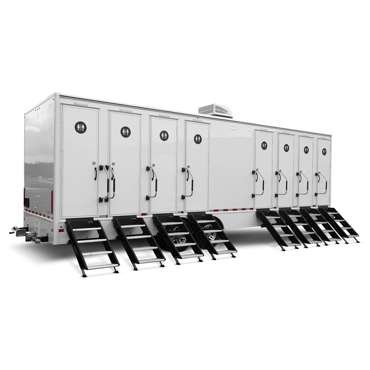 Satellite Suites has created a beautiful 28-foot, 8-door, 8-station trailer for high traffic events and maximum privacy. This trailer gives each user independent access to a private bathroom.