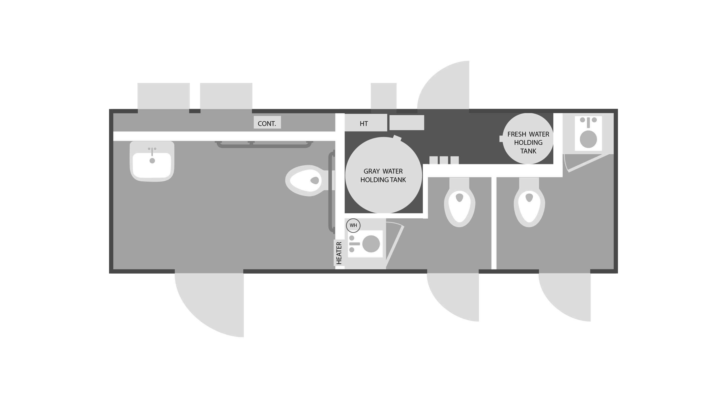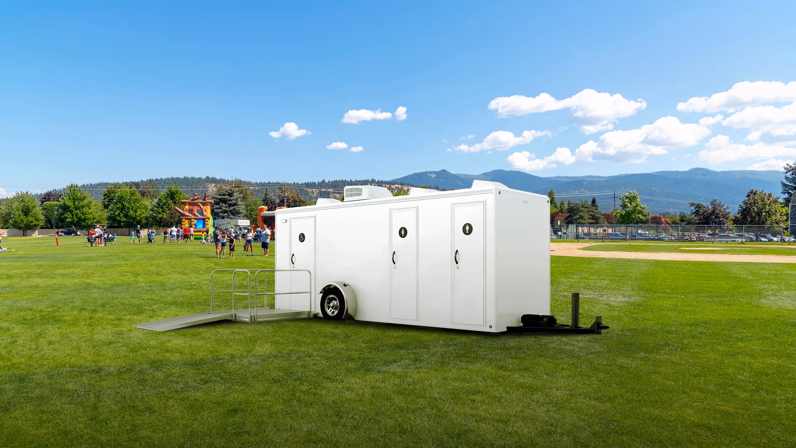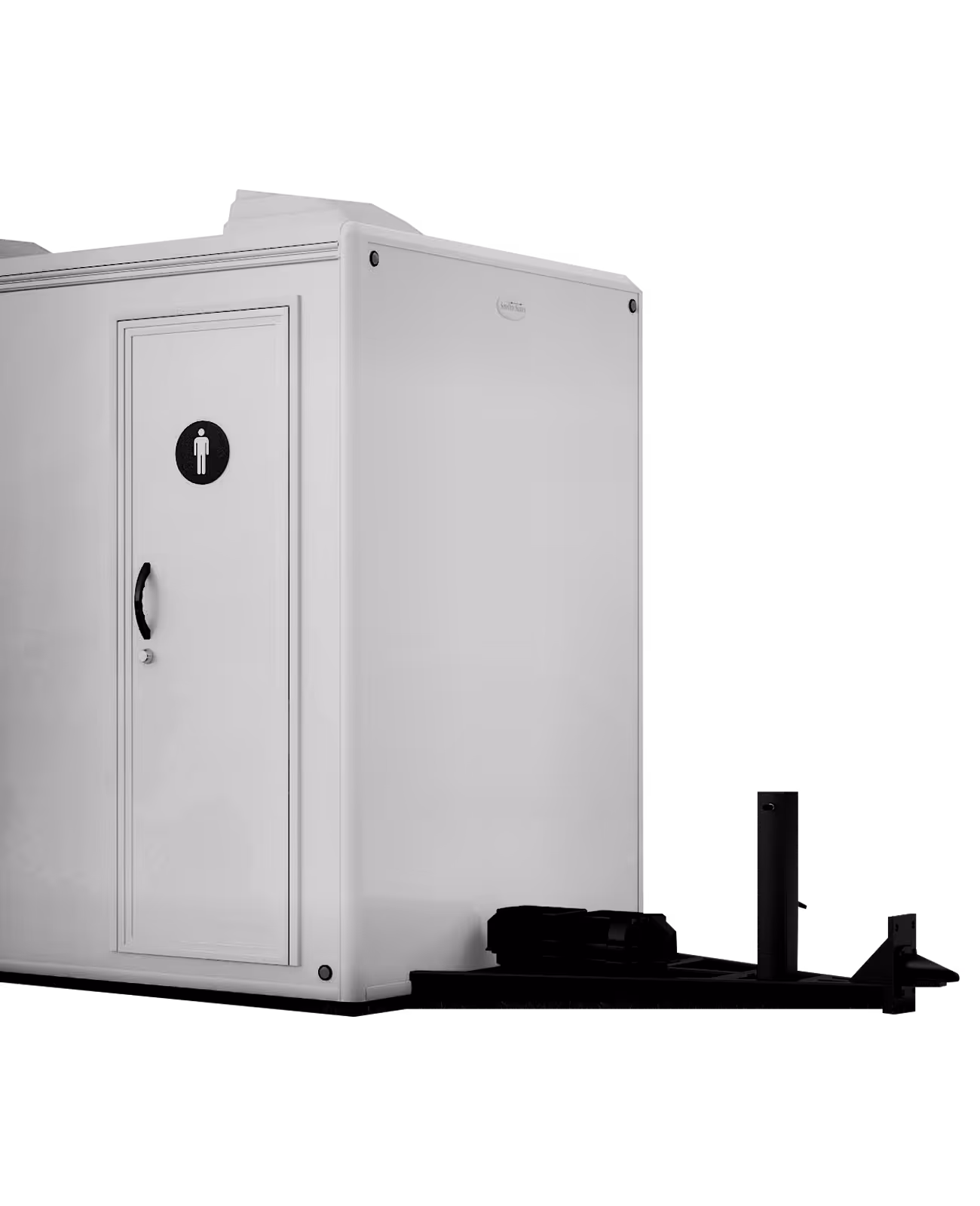 If flexibility is what you need, the ADA+2 provides it! An ADA, combined with two standard restroom stalls, offers a single solution for events needing both. The trailer rides on an air suspension system, making it easy to tow and even easier to lower and level. The wheels, attached to stub axles, disengage quickly and the air suspension system lowers the trailer gently to the ground. Once the trailer is in place, simply lower the attached platform, snap on the six-foot ramp, slide in the handrails and set-up is complete. The ramp has a very slight angle and the platform provides plenty of room for navigating and opening the door.