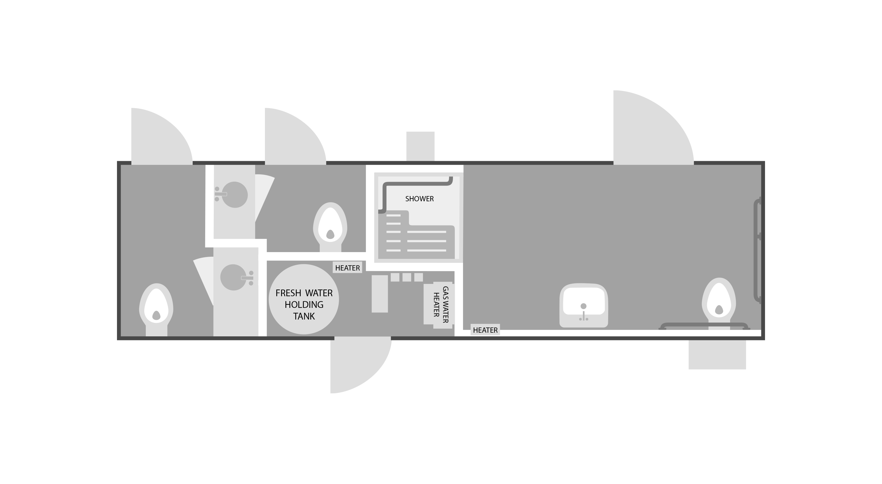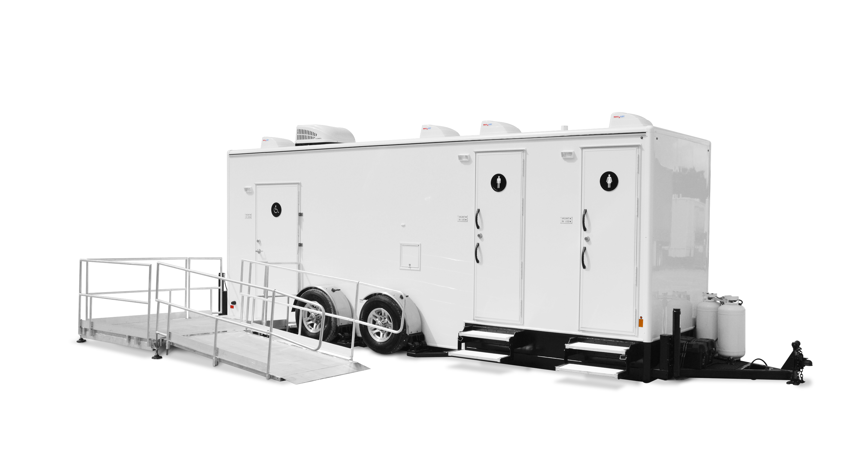If flexibility is what you need, the ADA Shower Plus 2 is what you want! An ADA shower, combined with two standard restroom stalls, offers a single solution for events, campsites, and construction sites needing both. The trailer rides on an air suspension system, making it easy to tow and even easier to lower and level. The wheels, attached to stub axles, disengage quickly and the air suspension system lowers the trailer gently to the ground. Once the trailer is in place, simply lower the attached platform, snap on the six-foot ramp, slide in the handrails and set-up is complete. The ramp has a very slight angle and the platform provides plenty of room for navigating and opening the door.