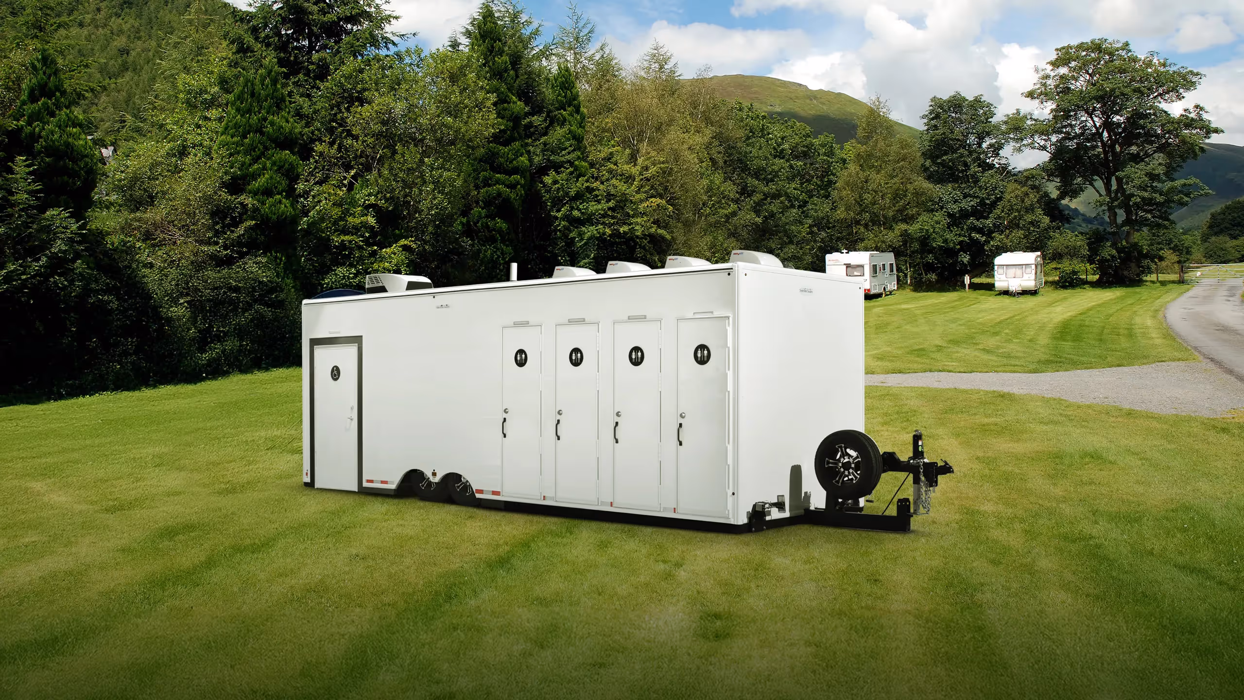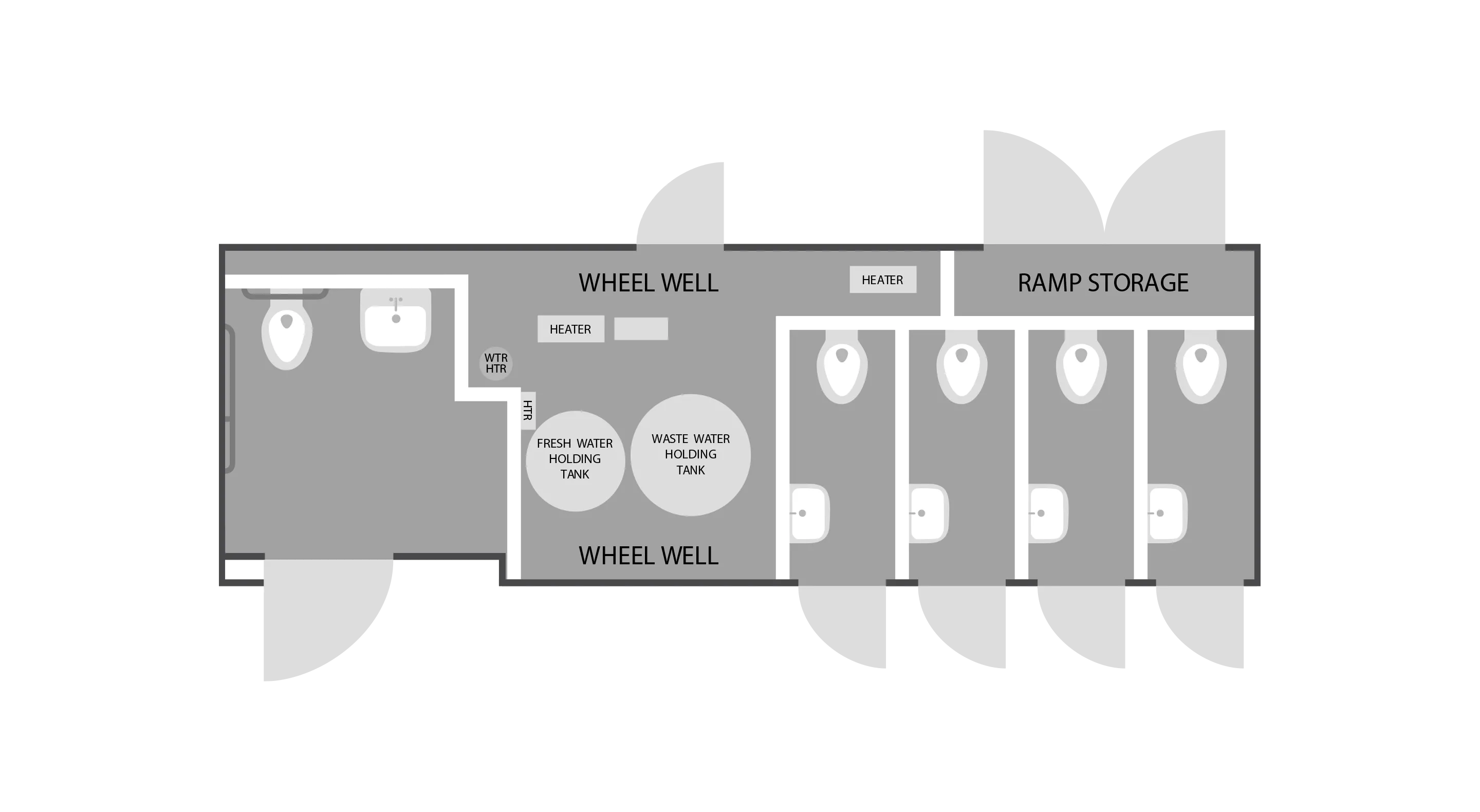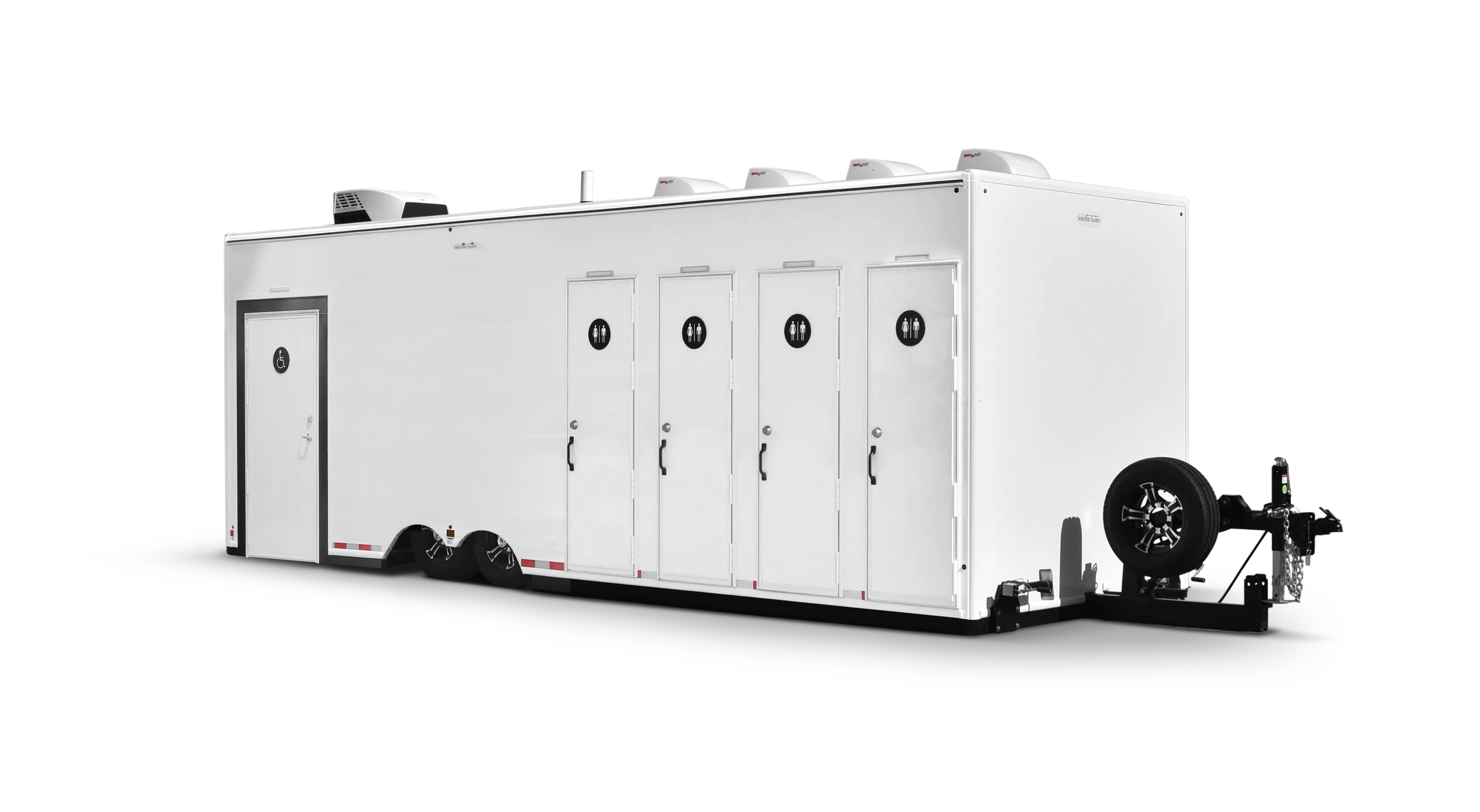If flexibility is what you need, the ADA plus 4-Station is what you want! This ADA 8x26' Plus 4, offers a single solution for events, campsites, and construction sites needing both. The trailer rides on an air suspension system, making it easy to tow and even easier to lower and level. The wheels, attached to stub axles, disengage quickly and the air suspension system lowers the trailer gently to the ground. Once the trailer is in place, simply lower the attached platform, snap on the ramp, slide in the handrails and set-up is complete. The ramp has a very slight angle and the platform provides plenty of room for navigating and opening the door.