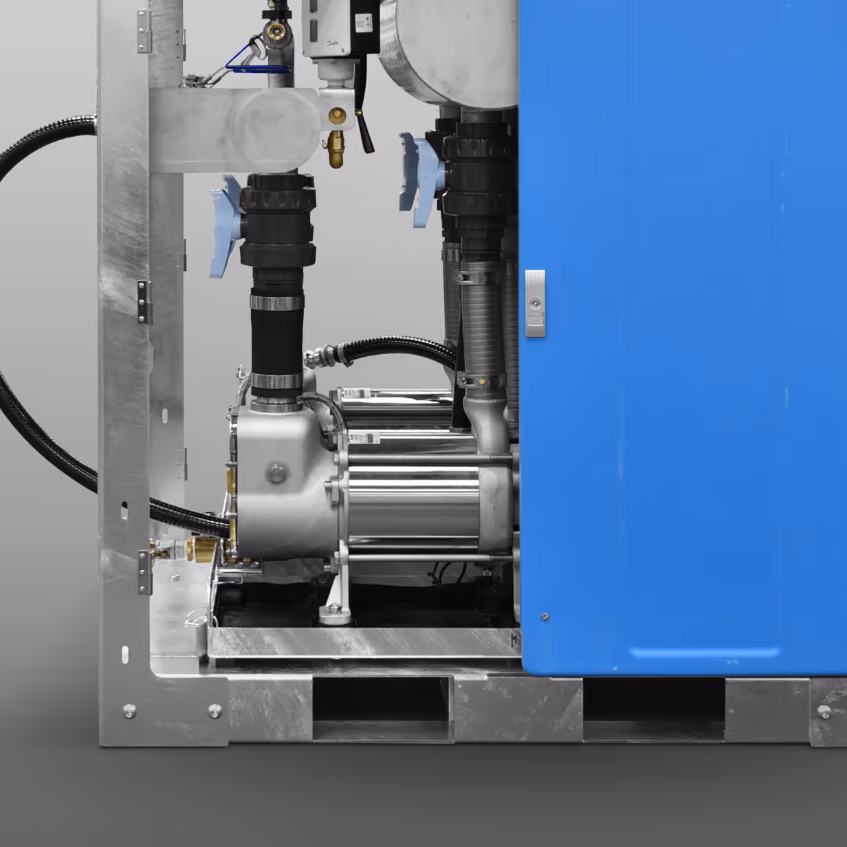 The vacuum unit creates vacuum, macerates sewage and discharges.