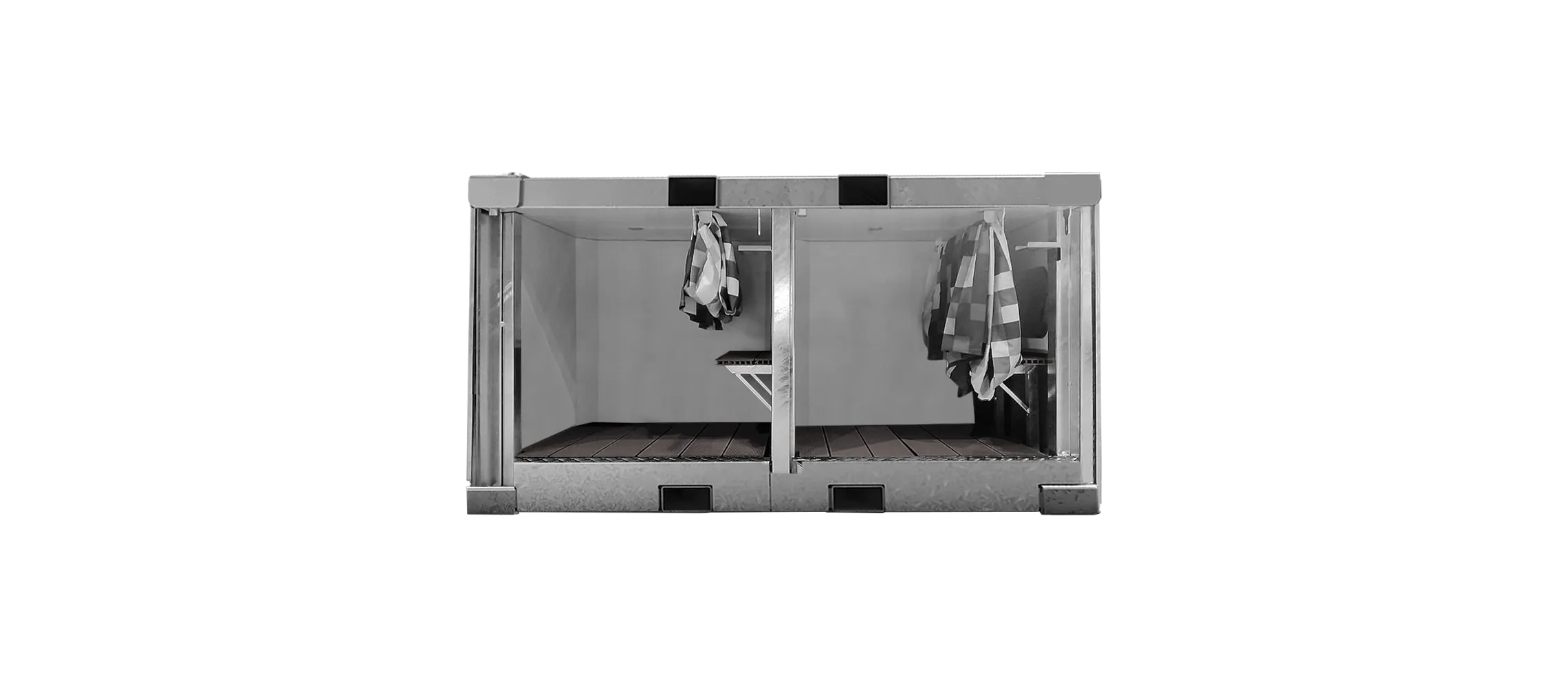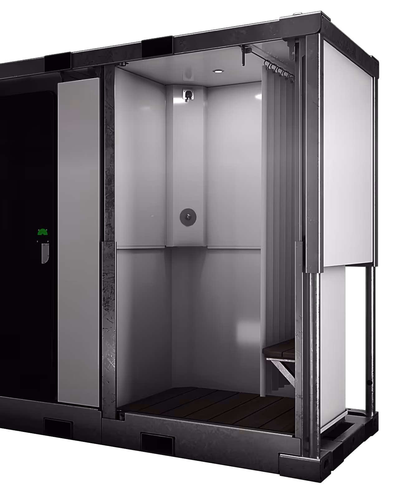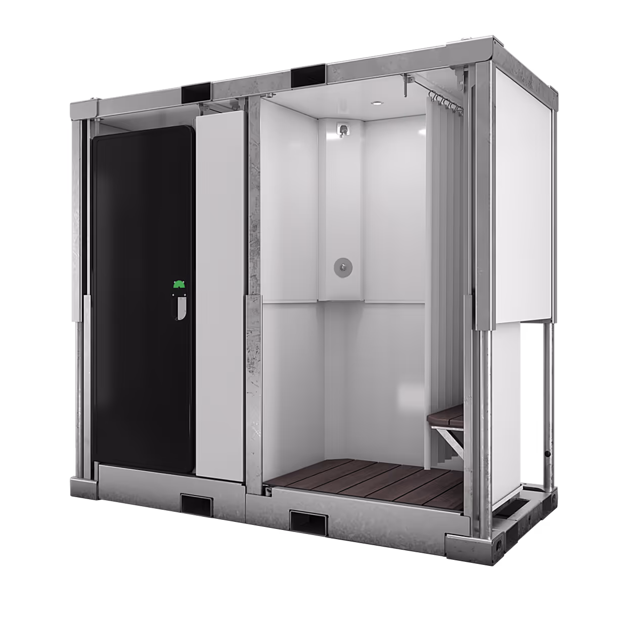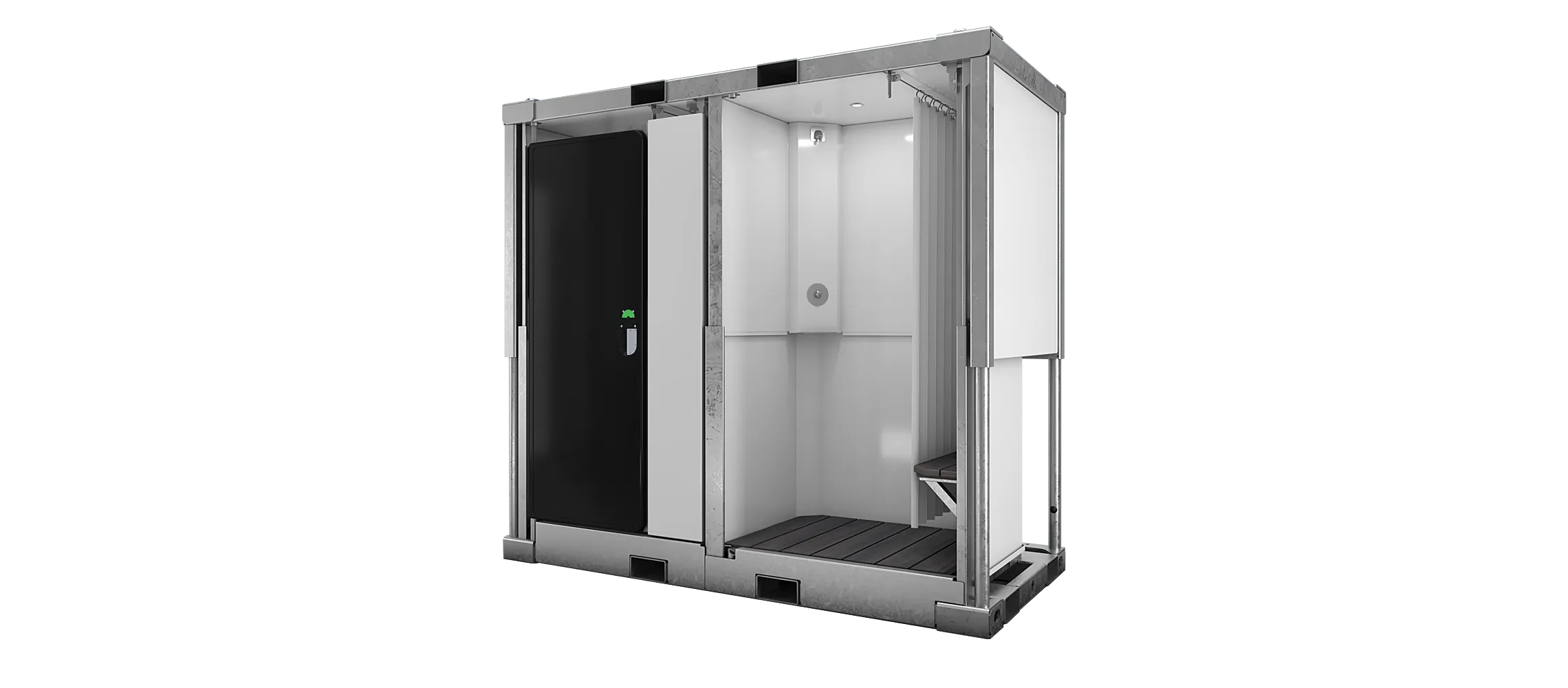 Satellite’s Sanitrax Shower Modules are often needed for events, festival campgrounds, military camps or temporary sites for humanitarian aid. We offer Smart Sustainable Sanitary Solutions for large groups of users. Each module consists of two showers. The attractively designed, spacious showers provide complete privacy and sufficient light and ventilation. A shower curtain allows for the dry and safe storage of clothing and valuables inside the stall itself. Each shower includes a water-saving shower head and LED light. Hot water supply is not included and supplied by others on site.