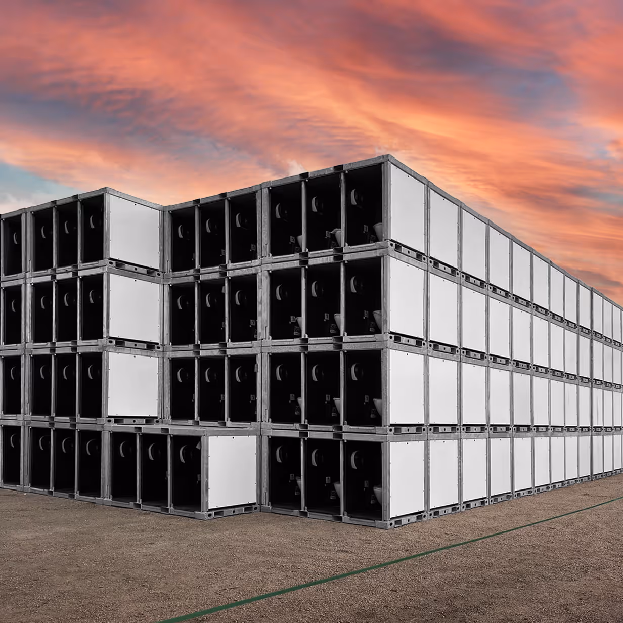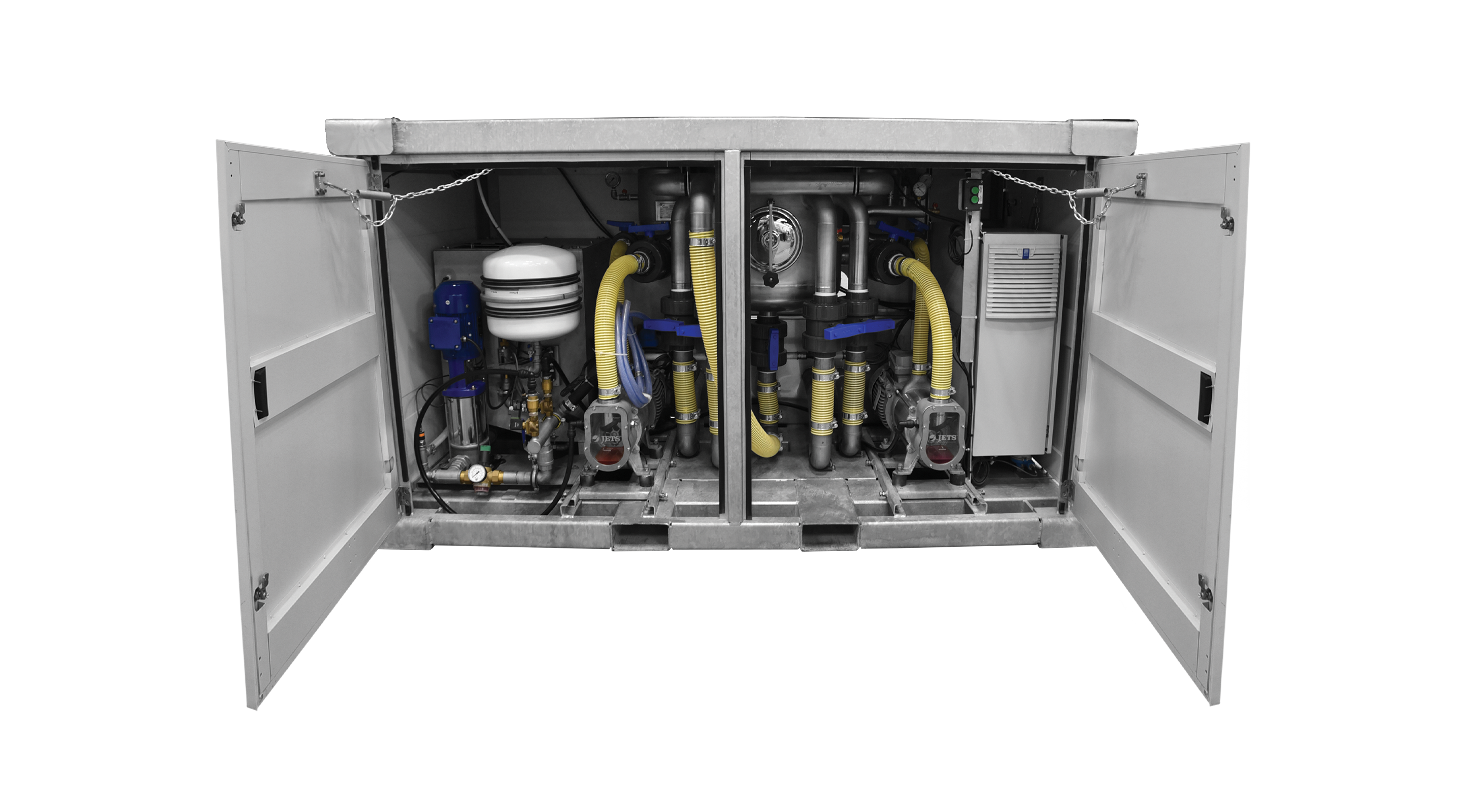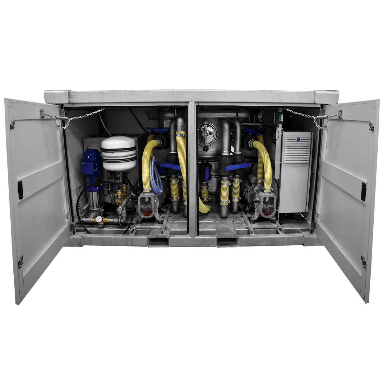 The Tech Module transports the wastewater away from the toilets and is equipped with a professional water booster system which provides the connected toilets with fresh water to make them all flush nicely. Flushing with fresh water makes vacuuming all the waste and most of the odors out of the toilet stall resulting in a very hygienic toilet system!